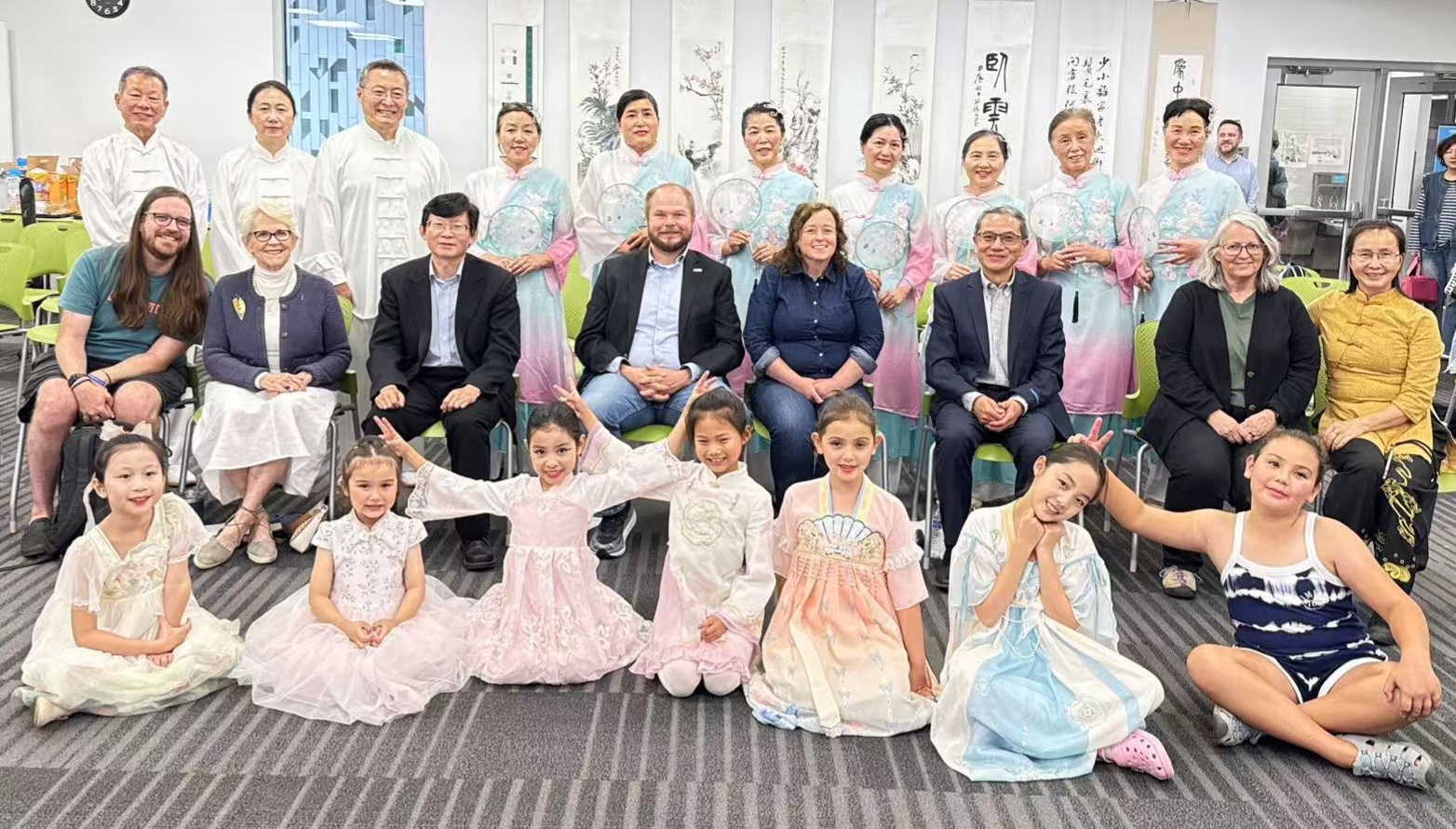 招待会上,赖逸珊、李涛与华人社区太极八卦爱好者们、刘瑶舞蹈学